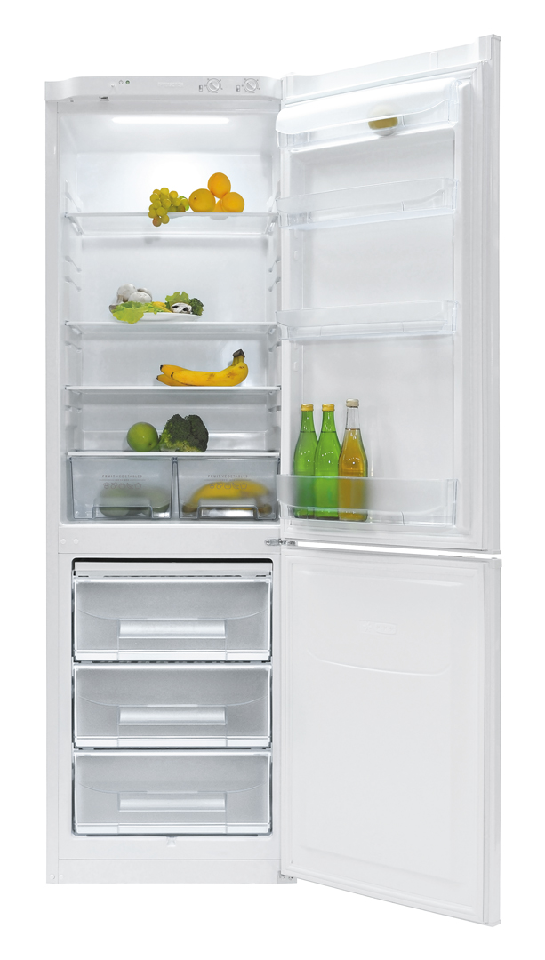 Полки из ударопрочного стекла выдерживают нагрузку до 40 кг. Их легко можно перемещать по высоте, что дает возможность разместить продукты
